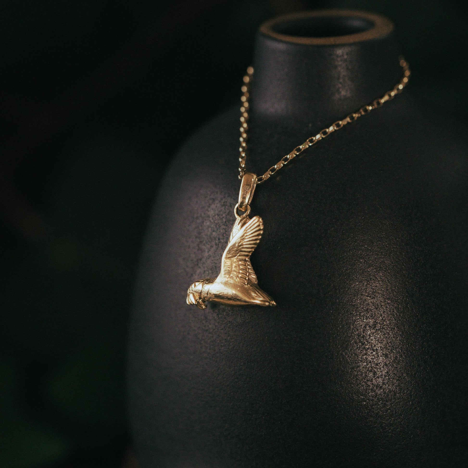 Re: Gold Flying Puffin with Fish Pendant Necklace