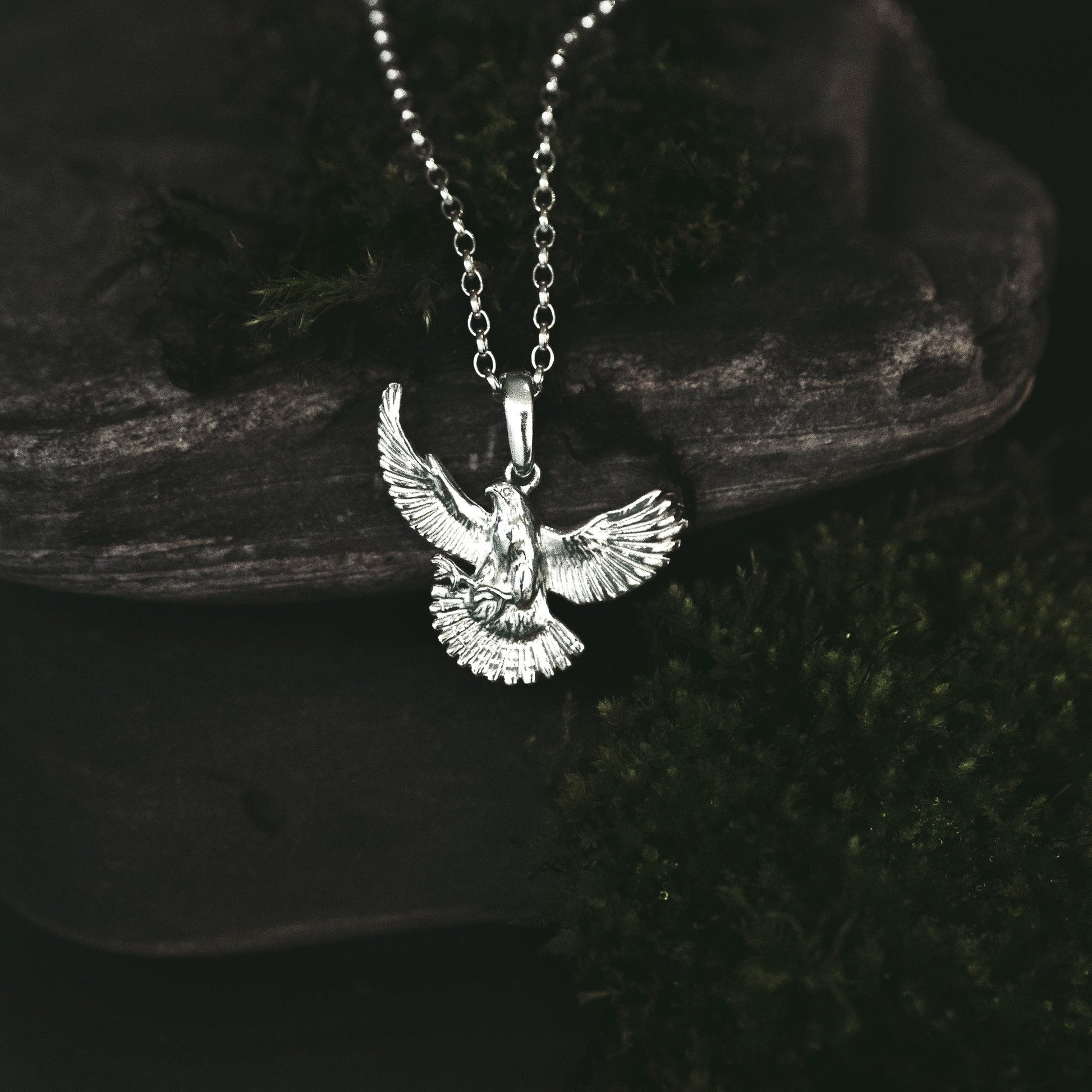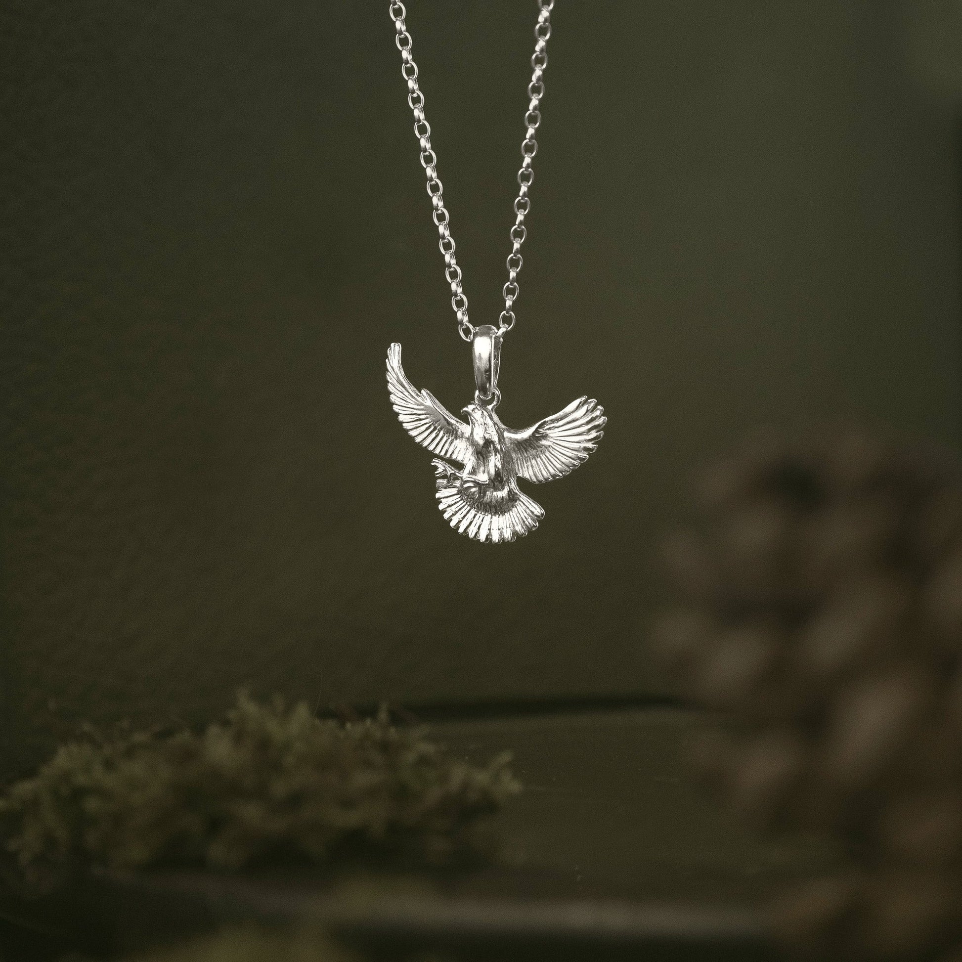 In this pendant, the falcon’s profile is carefully crafted in sterling silver, highlighting the bird’s distinct shape and elegant curved wings. Each piece has been designed to bring out the subtle lines that define the peregrine’s powerful build, while remaining lightweight and comfortable to wear.